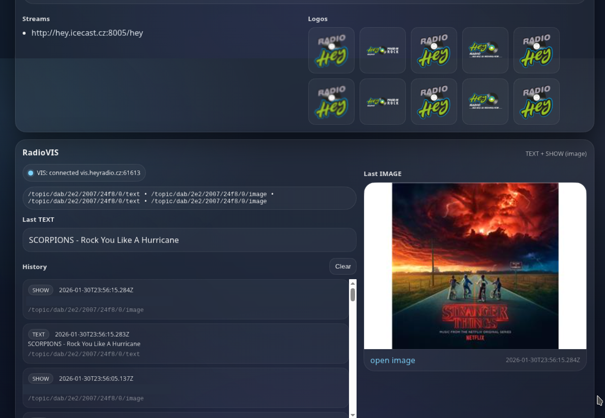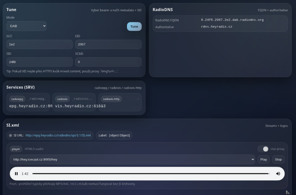 (Auto)rádio už tedy ví, kam se spojit na stream, ví alternativní DAB a FM frekvence a mělo by to fungovat jak zamýšlí norma. Celý SI (service information) soubor je poměrně dlouhý a složitý, jsou v něm informace o logu stanice v různých rozlišeních, informace o stanici, alternativní frekvence v DAB a FM, ale rozebírat si ho nebudeme. Kdo chce, může si jak inspiraci načíst http://epg.zunradio.cz/radiodns/spi/3.1/SI.xml nebo http://epg.radiosazava.cz/radiodns/spi/3.1/SI.xml nebo složitější Český Rozhlas https://d2qydwcycui0ka.cloudfront.net/b0d51624f9a7e63df994c2df9128f614250c2861aeb9f55a19146e9877b2201b.xml